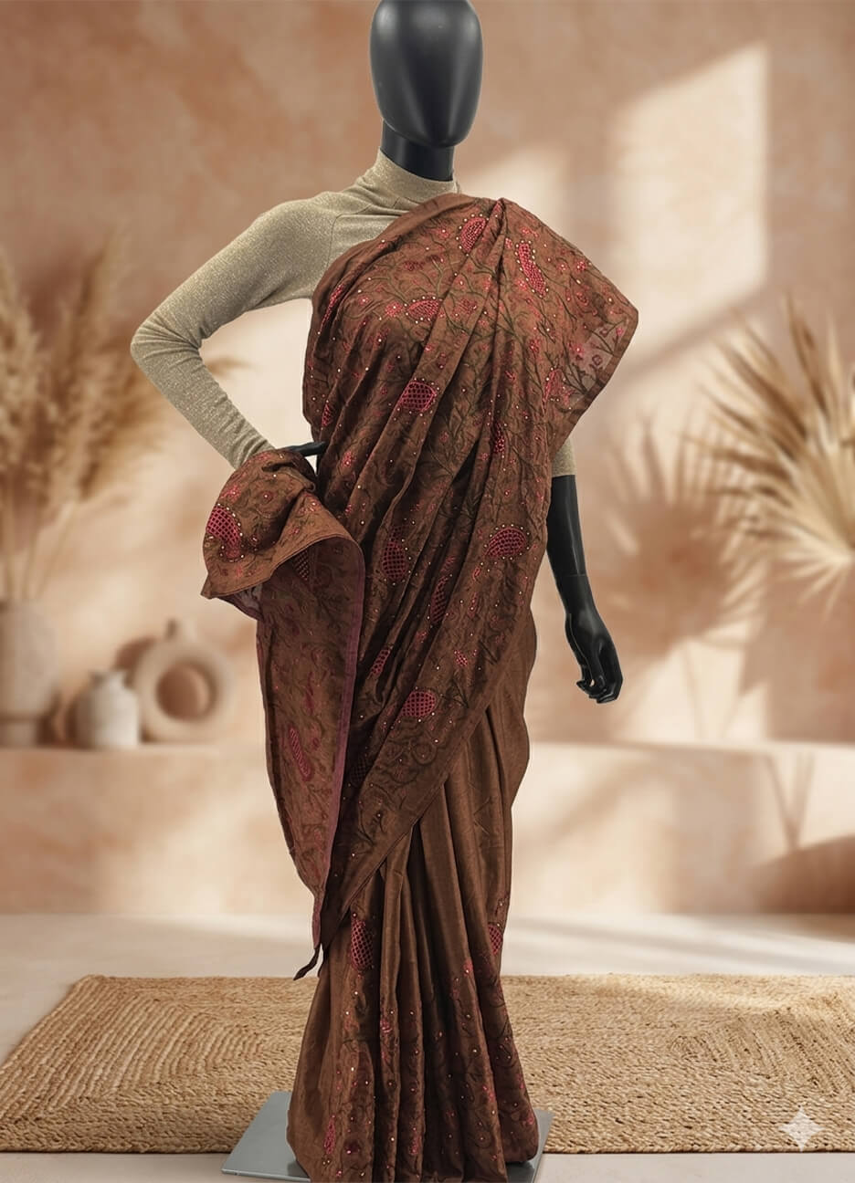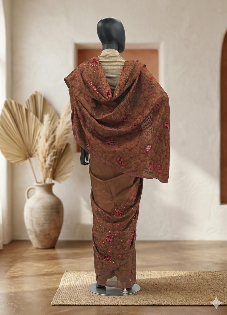 Draped in tradition, this exquisite Tussar silk saree beautifully tells a story of timeless elegance and craftsmanship. The rich brown base is enhanced with intricate red embroidery, creating a striking contrast that reflects heritage artistry.