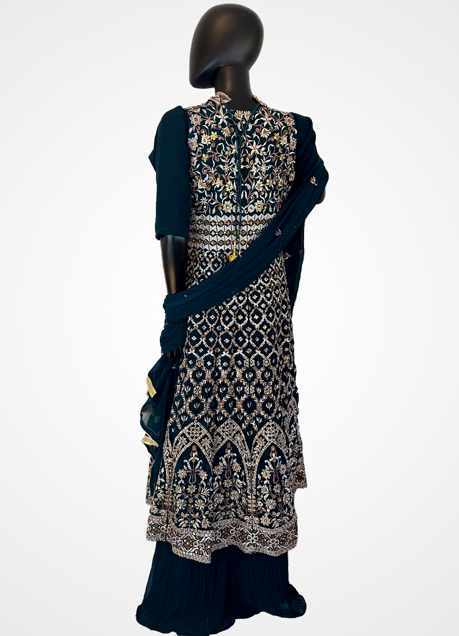 A luxurious dark green chiffon long gown set featuring intricate all-over hand mirror work, paired with a flowing skirt and matching scarf. Designed to make a statement at weddings, festive celebrations, and elegant evening occasions.