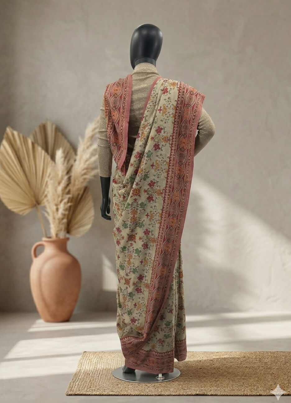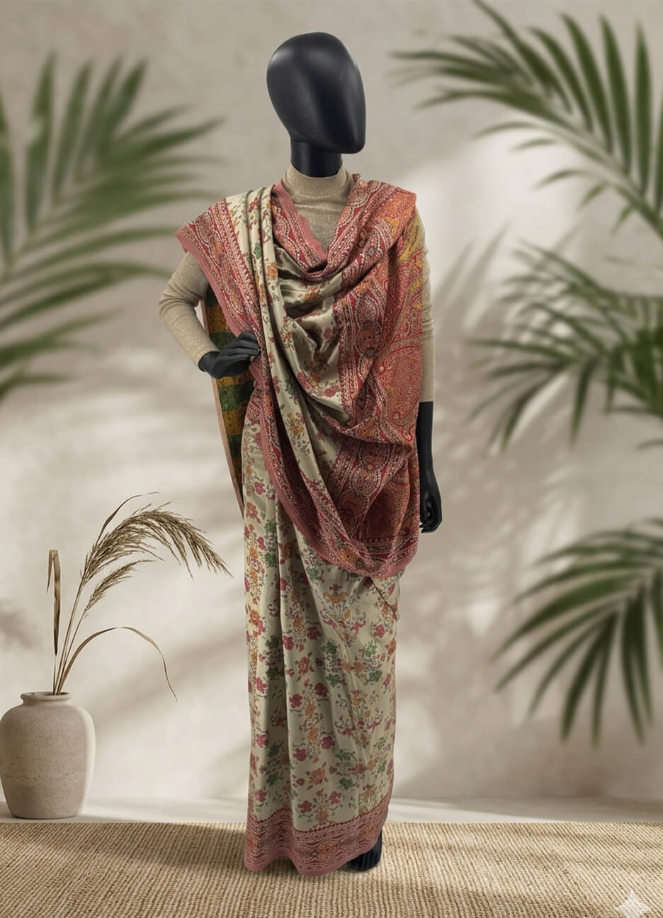 Experience timeless elegance with this beautifully crafted pashmina silk saree, featuring a delicate blend of floral motifs and traditional patterns. Inspired by the rich heritage of the Indian subcontinent, this saree reflects classic artistry with a refined modern touch.