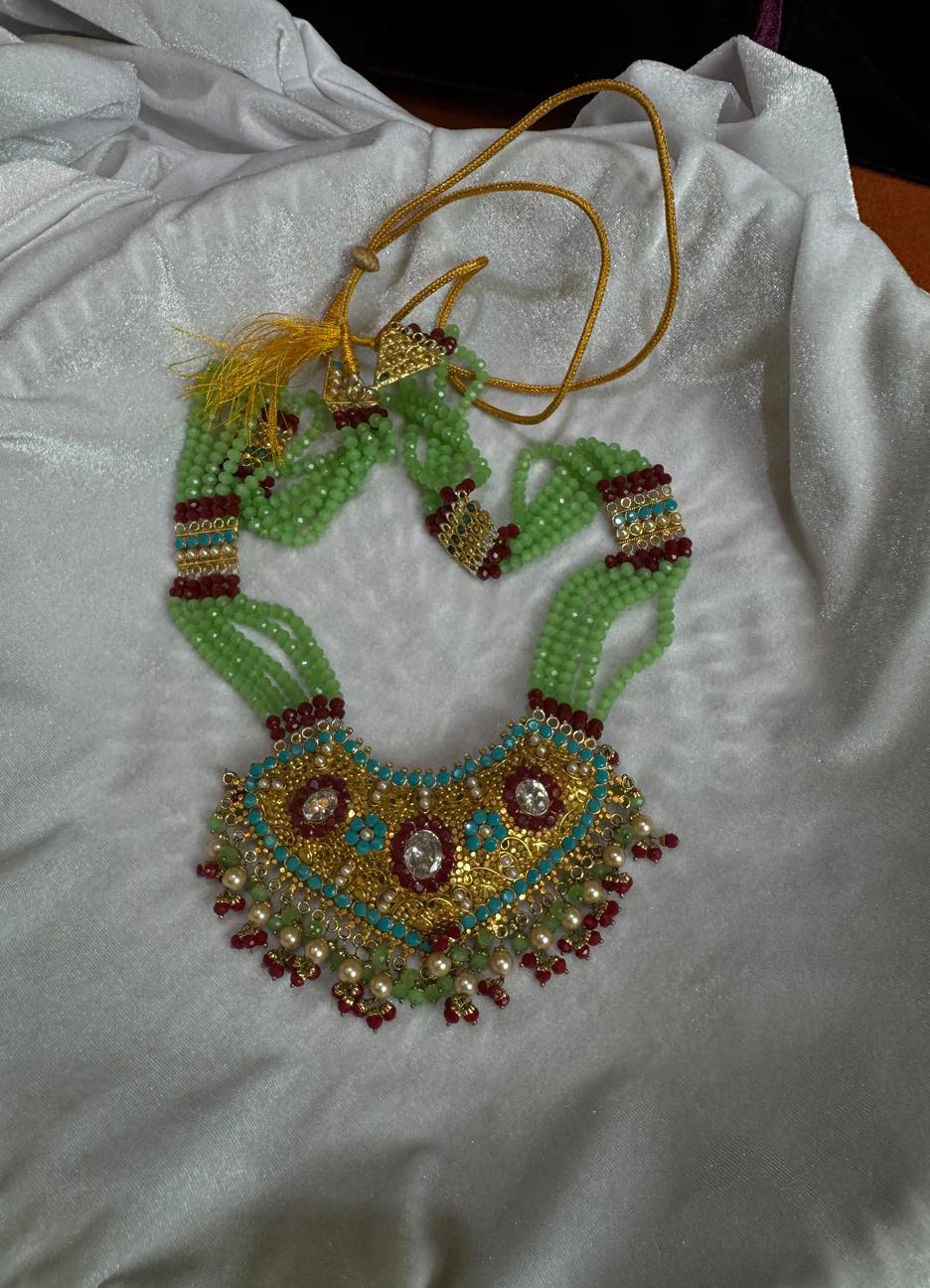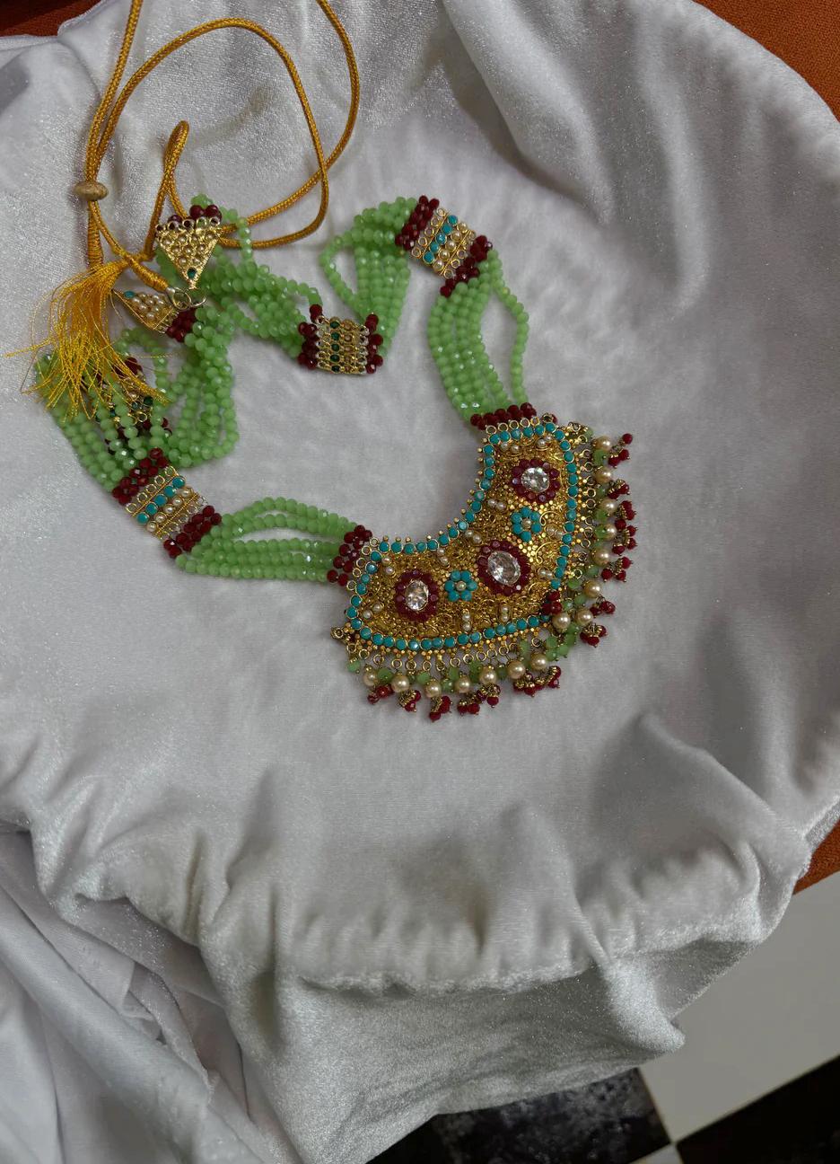 Bring timeless elegance to your collection with this stunning gold plated necklace crafted from zinc alloy. Designed with emerald beads, sparkling rubies, and glowing pearls, it captures the essence of royal charm. Its vibrant colors and intricate detailing make it a perfect statement piece for weddings, festive occasions, or traditional celebrations.