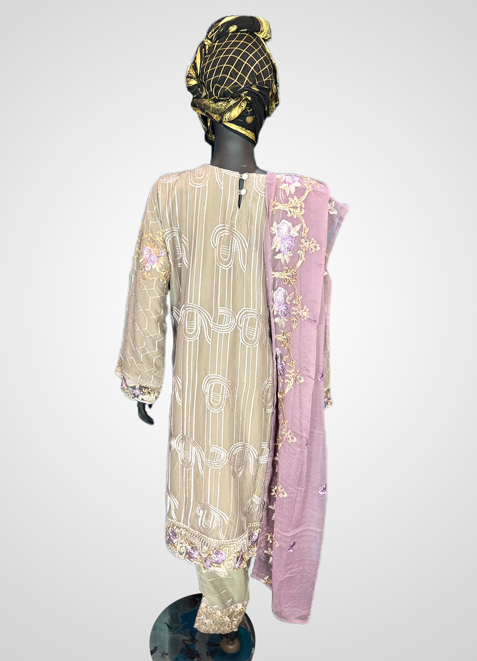 An elegant grey and pink chiffon shalwar kamiz set featuring delicate embroidery and detailed handwork. Paired with a matching dupatta, this refined ensemble is perfect for festive and formal occasions.