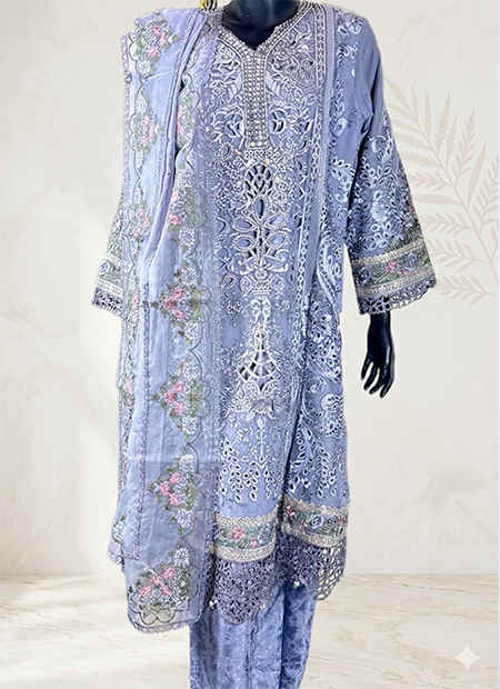 An elegant grey and pink shalwar kamiz set crafted from luxurious tissue fabric, featuring intricate all-over hand embroidery with golden and white accents. Paired with a matching dupatta, this ensemble is perfect for festive and formal occasions.