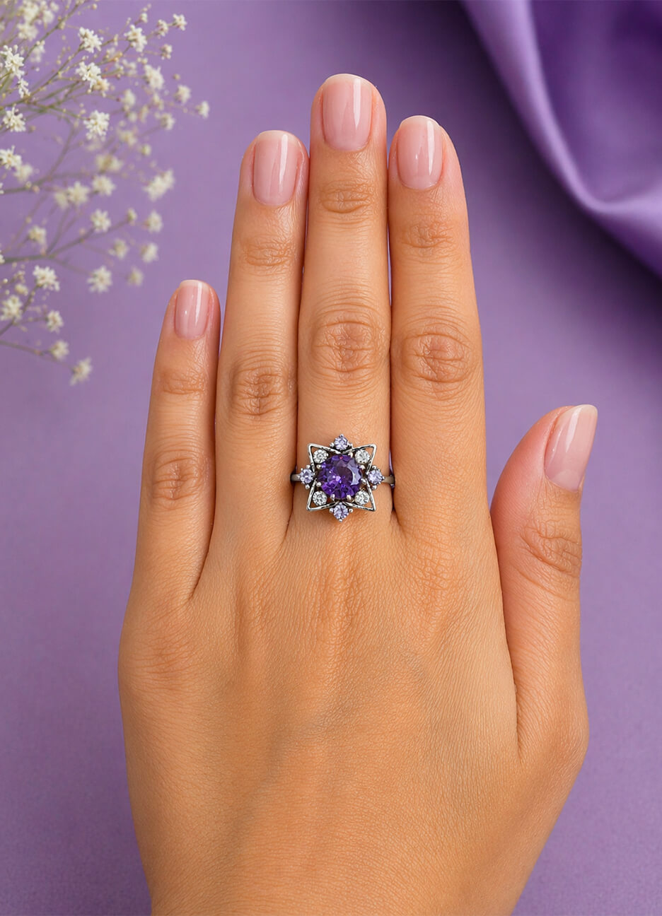 Elegant handmade pure silver star-shaped ring featuring a radiant amethyst center stone with zirconia accents and an oxidized antique finish.