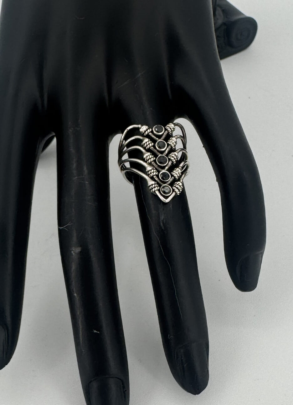 Bold handmade pure silver statement ring featuring black zirconia stones with an oxidized antique finish for a unique and edgy look.