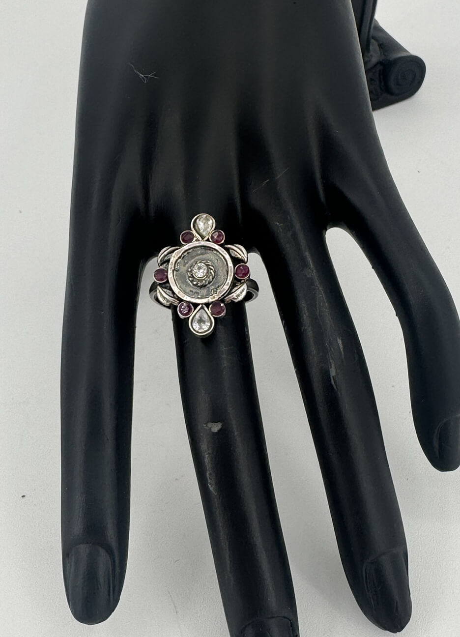 Elegant handmade pure silver ring featuring delicate floral detailing with zirconia stones and an oxidized antique finish.
