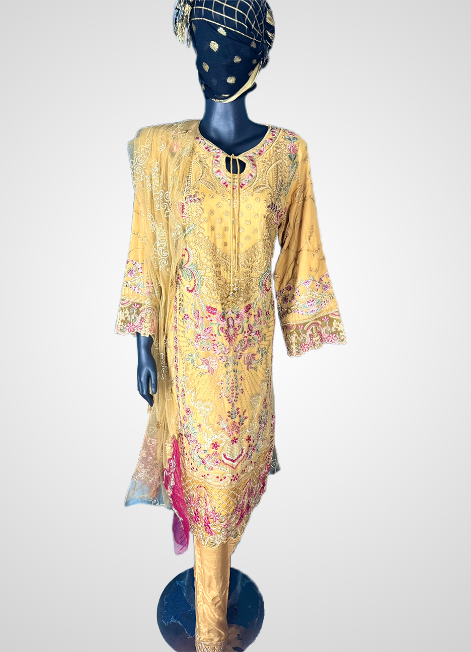Bright, graceful, and exquisitely detailed, this Handmade Yellow Embroidered Shalwar Kameez Set is a celebration of traditional craftsmanship and festive elegance. Made from luxurious crêpe chiffon fabric, the outfit offers a lightweight, flowy drape while maintaining a rich, refined look.