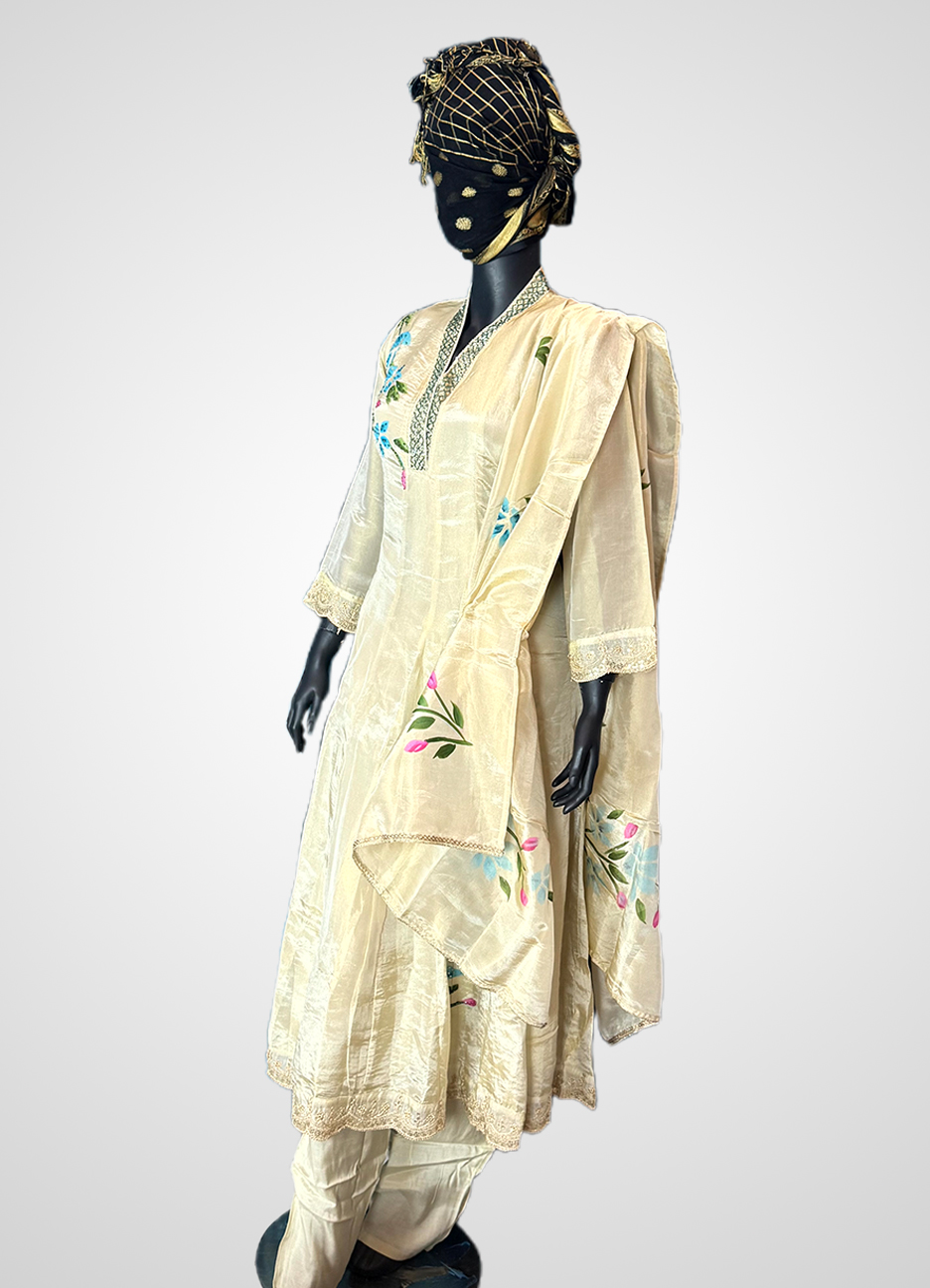 An elegant ivory silk long dress set featuring artistic hand brush painting, enhanced with delicate bead and stone work. Paired with matching pants and scarf, this refined ensemble is designed for graceful festive and formal wear.