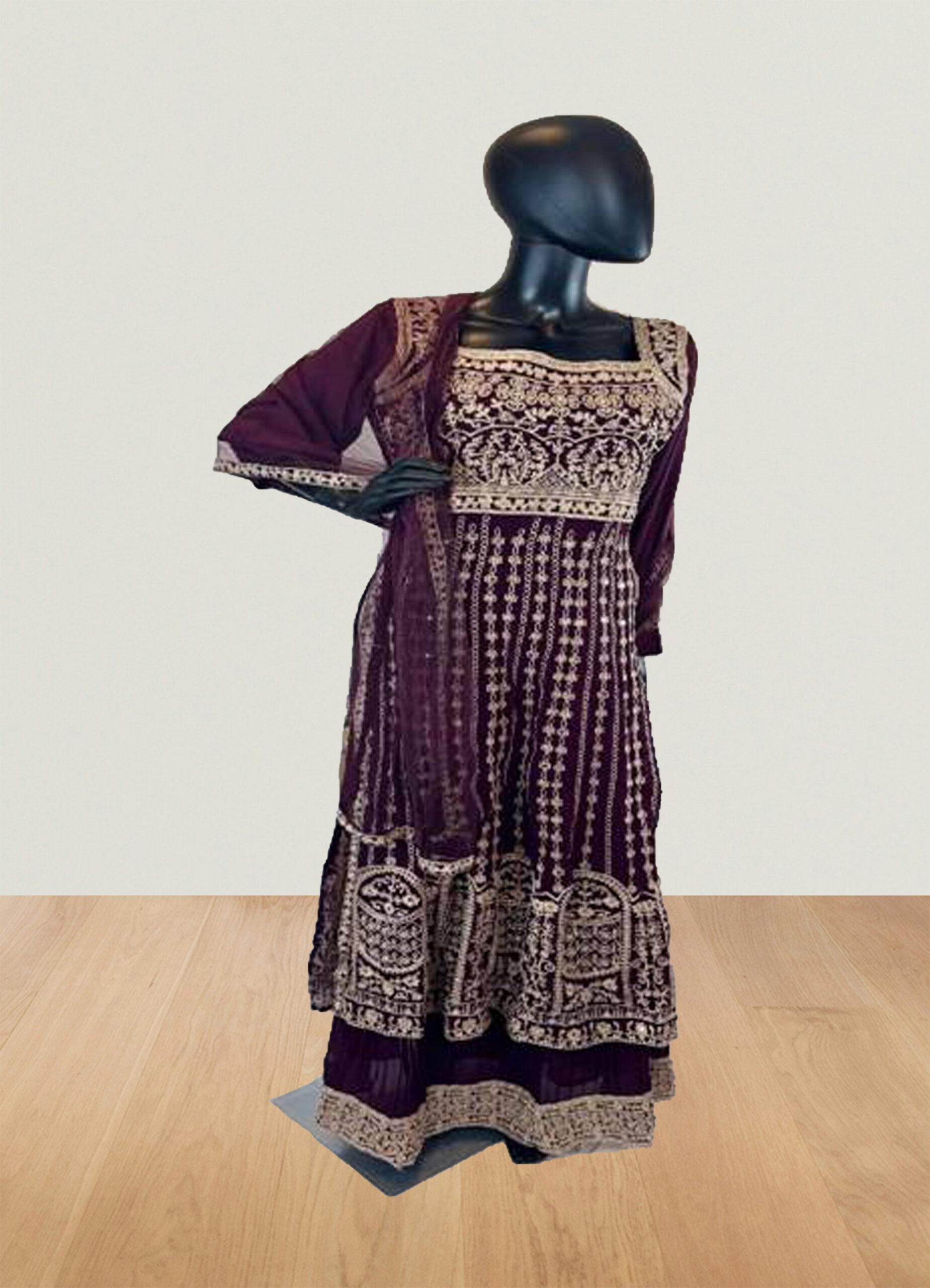 Drape yourself in timeless elegance with this maroon Anarkali suit, exquisitely detailed with intricate beige embroidery that flows gracefully from the neckline to the hem. The traditional craftsmanship, paired with a modern silhouette, makes this outfit a masterpiece for festive and formal occasions alike.