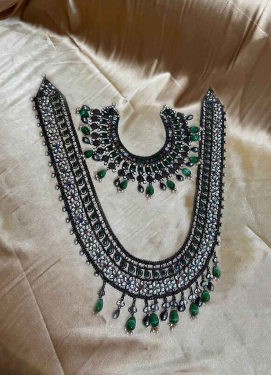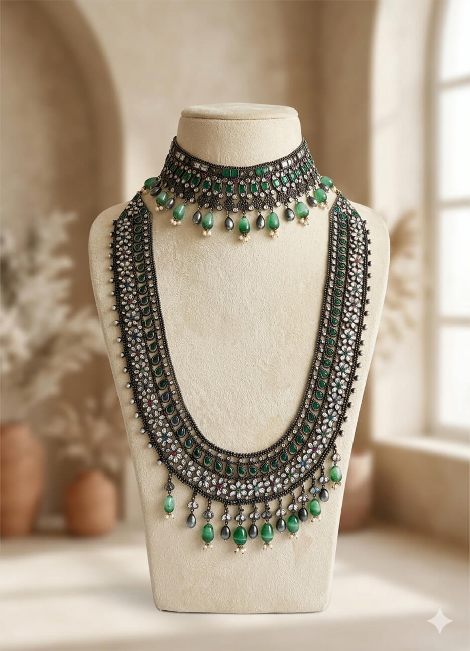 Make a timeless statement with this elegant oxidized necklace, beautifully crafted with shimmering beads and striking emerald drop stones. The intricate design blends..