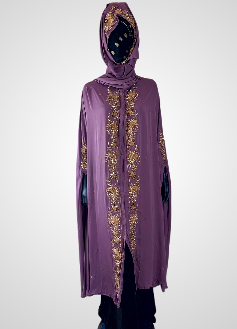 A luxurious pinkish purple abaya cape featuring intricate all-over hand embroidery with stone embellishments. Designed for graceful modest fashion, this free-size piece is perfect for formal and special occasions.
