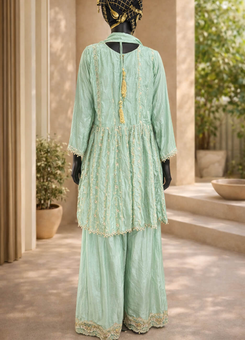 An elegant green chiffon shalwar kamiz set featuring delicate all-over embroidery, paired with a matching dupatta. Light, graceful, and beautifully detailed—perfect for festive and semi-formal occasions.