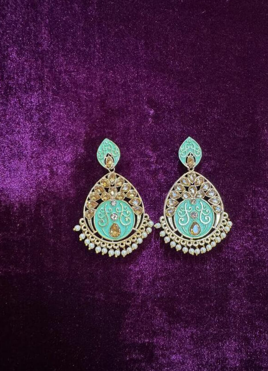 Turn heads with these striking teal and gold earrings, crafted with stainless steel for lasting durability and elegance. Featuring intricate detailing and a royal blend of gold and teal, these earrings bring a touch of sophistication to both traditional and modern outfits. Perfect for parties, festive occasions, or everyday chic styling.