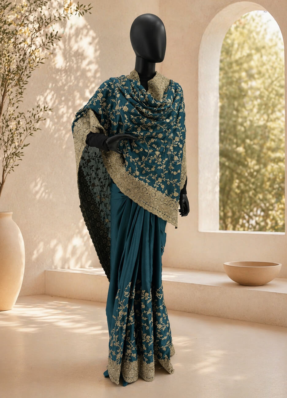 The luxurious silk fabric offers a smooth texture and graceful drape, while the detailed hand embroidery enhances its premium appeal. The contrast of deep teal blue with shimmering gold creates a regal aesthetic, making it a perfect choice for special occasions.