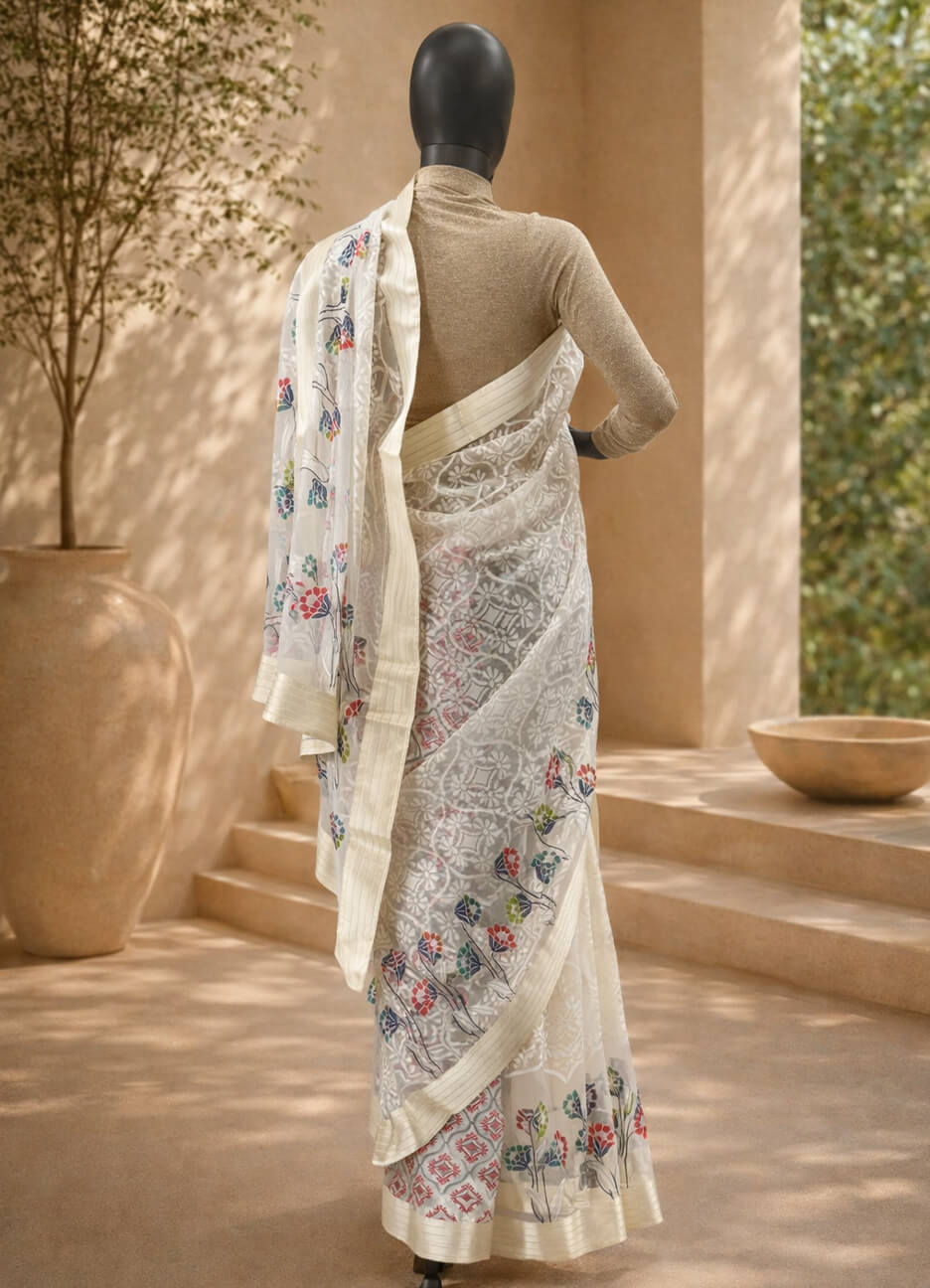 Graceful white tissue silk saree featuring delicate floral embroidery—perfect for timeless elegance and refined festive styling.