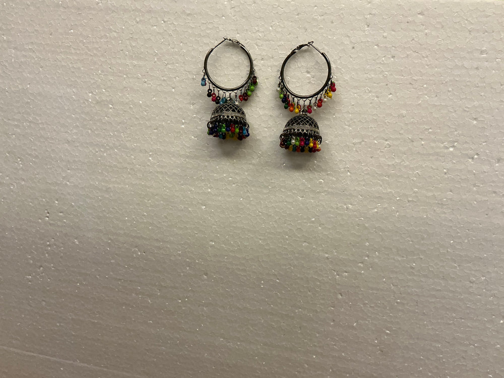 Add a touch of vibrant tradition to your look with these colorful jhumka earrings. Designed with intricate beadwork and a detailed silver-inspired finish, these earrings beautifully blend classic craftsmanship with modern flair. Made with a silver component, zinc, and alloy, the oxidized effect enhances their timeless appeal. Perfect for festive occasions, cultural events, or daily wear with an ethnic outfit.