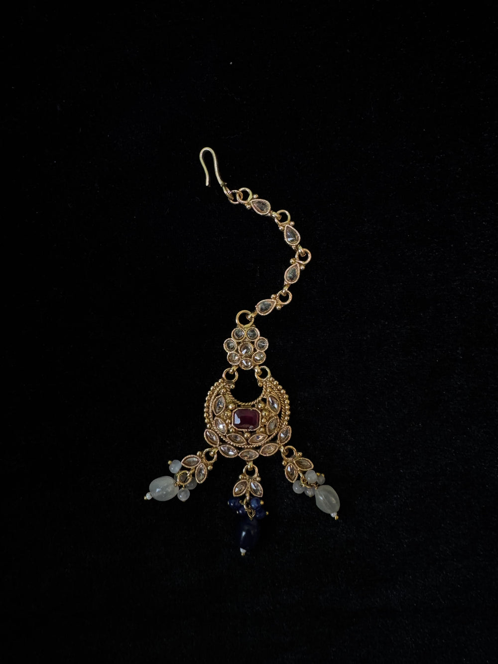 Add a touch of regal beauty to your look with this gold-plated tikli, delicately crafted and adorned with ruby and sapphire-inspired stones. Perfect for weddings, festivals, or special occasions, this traditional headpiece brings out the grace of heritage jewelry while complementing modern bridal fashion. Lightweight yet intricate, it is a statement accessory every jewelry collection deserves.