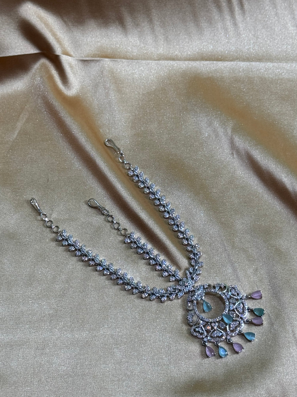 Graceful and regal, this Sitapati necklace is crafted with sparkling cubic zirconia (American diamonds) that radiate elegance with every glance. Its intricate design reflects timeless artistry, making it the perfect statement piece for weddings, festive occasions, or evening wear.