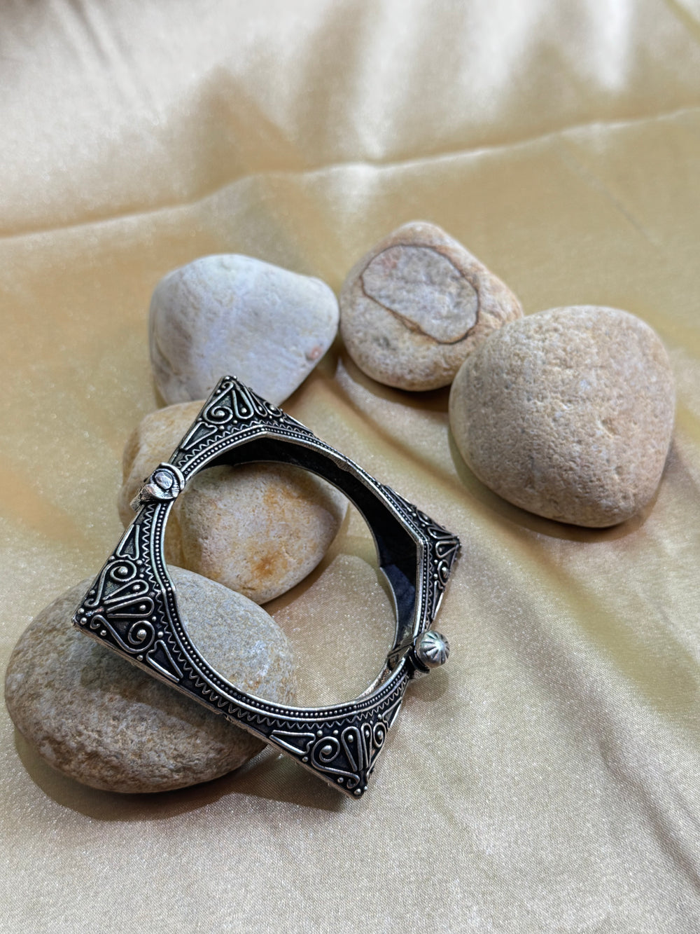 Elevate your style with this intricately designed vintage-inspired bangle, crafted in oxidized brass for a timeless silver finish. Featuring bold geometric and ornate patterns, this unique piece is secured with a screw design for comfort and durability. A perfect blend of tradition and elegance, it makes a striking accessory for both ethnic and contemporary outfits.
